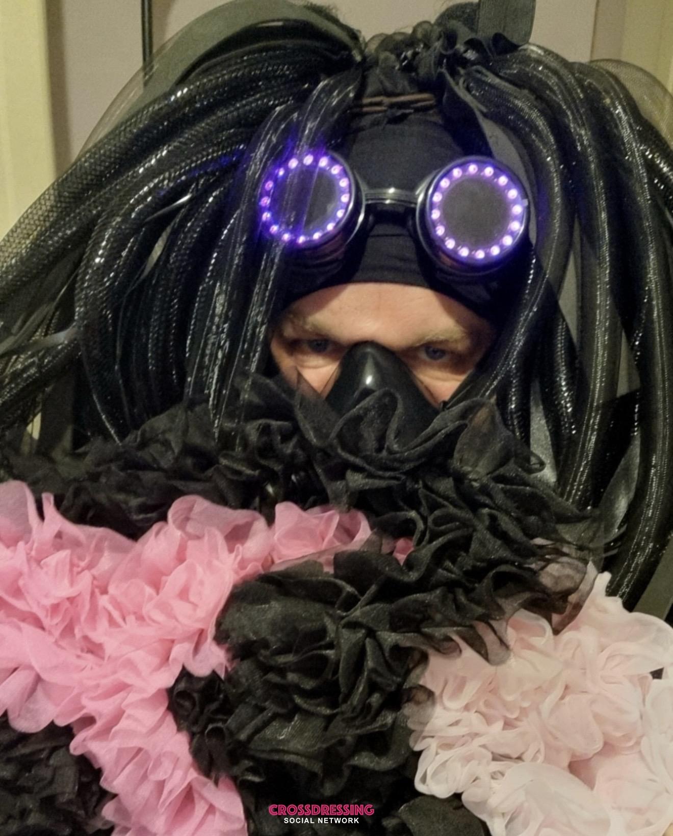 Rain sheets the asphalt black and glossy. Neon bleeds upward in acid pinks, cyan, violent violet; holographic serpents twist through mist twenty stories overhead, advertising dreams no one can afford. Damp wind lifts the black silk hijab edged in silver so it floats behind me like a separate wing. Beneath, the ruffled gown moves in slow, liquid obedience to each breath, pale chiffon catching stray photons and scattering them soft against wet pavement.