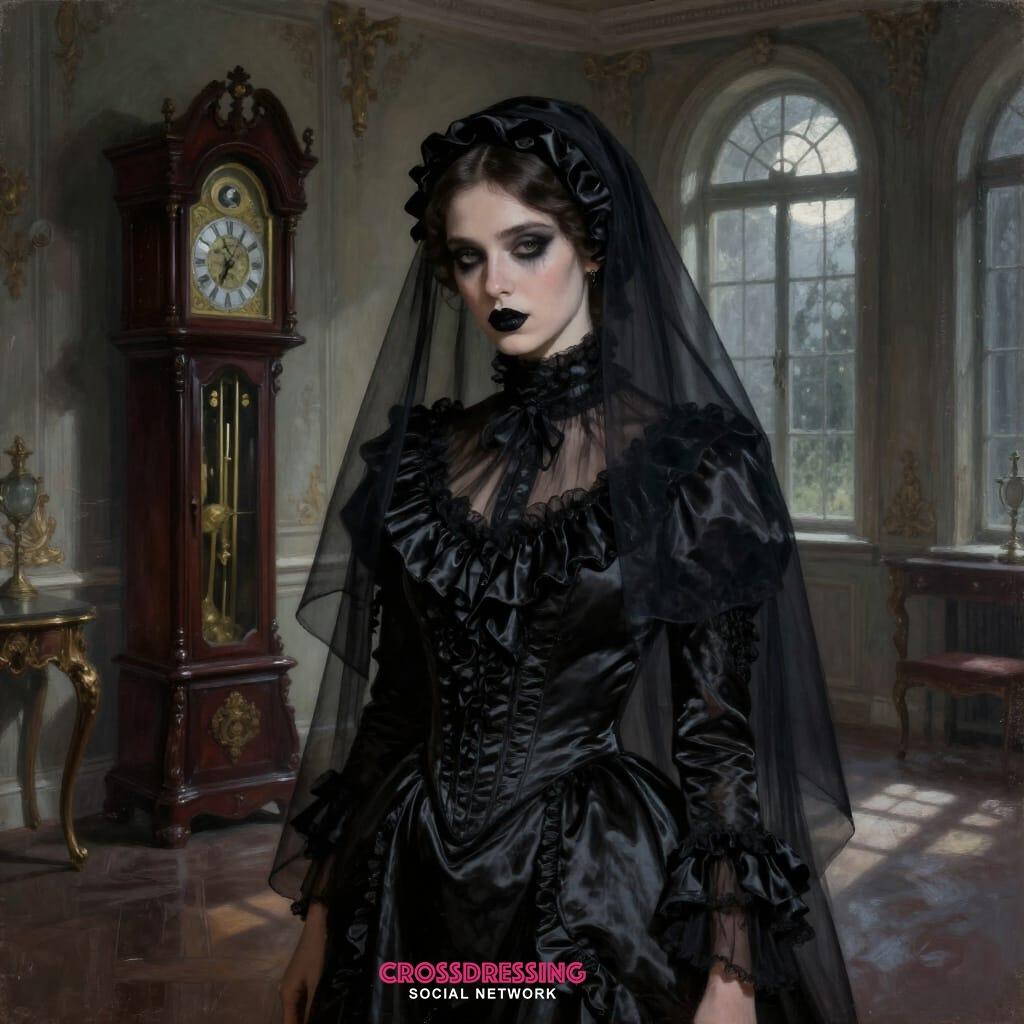 I stand before the tall cheval mirror in our bedroom, the one we once laughed about because it tilted just enough to make us look taller, more dramatic. Now it simply reflects truth. The long black satin gown slides against my skin with every small shift—cool at first touch, then warming to body heat until it feels like a second, mourning skin. The subtle sheen catches the single beeswax candle on the dresser: tiny liquid stars that ripple down my chest whenever I breathe. Each rustle is a whisper, silk on silk, like her voice used to be when she leaned close and murmured secrets only we knew. The oversized black satin headscarf is wrapped with ritual care, its weight pressing gently against my temples. Over it drapes the sheer black chiffon voile veil, layers so gossamer thin that the candle flame behind me turns them into trembling smoke. When I exhale, the finest filaments lift and settle again against my cheeks, a cool, feathery kiss that makes me close my eyes. Through the veil the world softens: edges blur, the room becomes a daguerreotype of itself, sepia grief in motion. I painted my lips tonight deepest matte black, almost velvet, the colour of spent roses and midnight ink. When I press them together, I taste the faint waxy bitterness of the pigment, a small sharp reminder that I am still here, tasting, feeling. My eyes are rimmed in kohl so dense it drinks the light; blinking feels luxurious, deliberate, the lashes heavy with mascara that leaves faint shadows on my cheeks when tears threaten, and they do, often, silently.